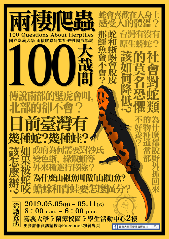 (二)海報講解:配合本校百年校慶,以《兩棲爬蟲100大哉問》為標題,透過本社臉書粉絲專頁蒐集大眾對兩棲爬蟲類的疑問,藉此介紹兩棲爬蟲相關知識、解開民眾對這些動物的迷思與誤解;另有數種兩爬類外來種介紹海報、如何化解人蛇衝突建議、外來種(兩棲爬蟲類為主的)防治政令宣導等。