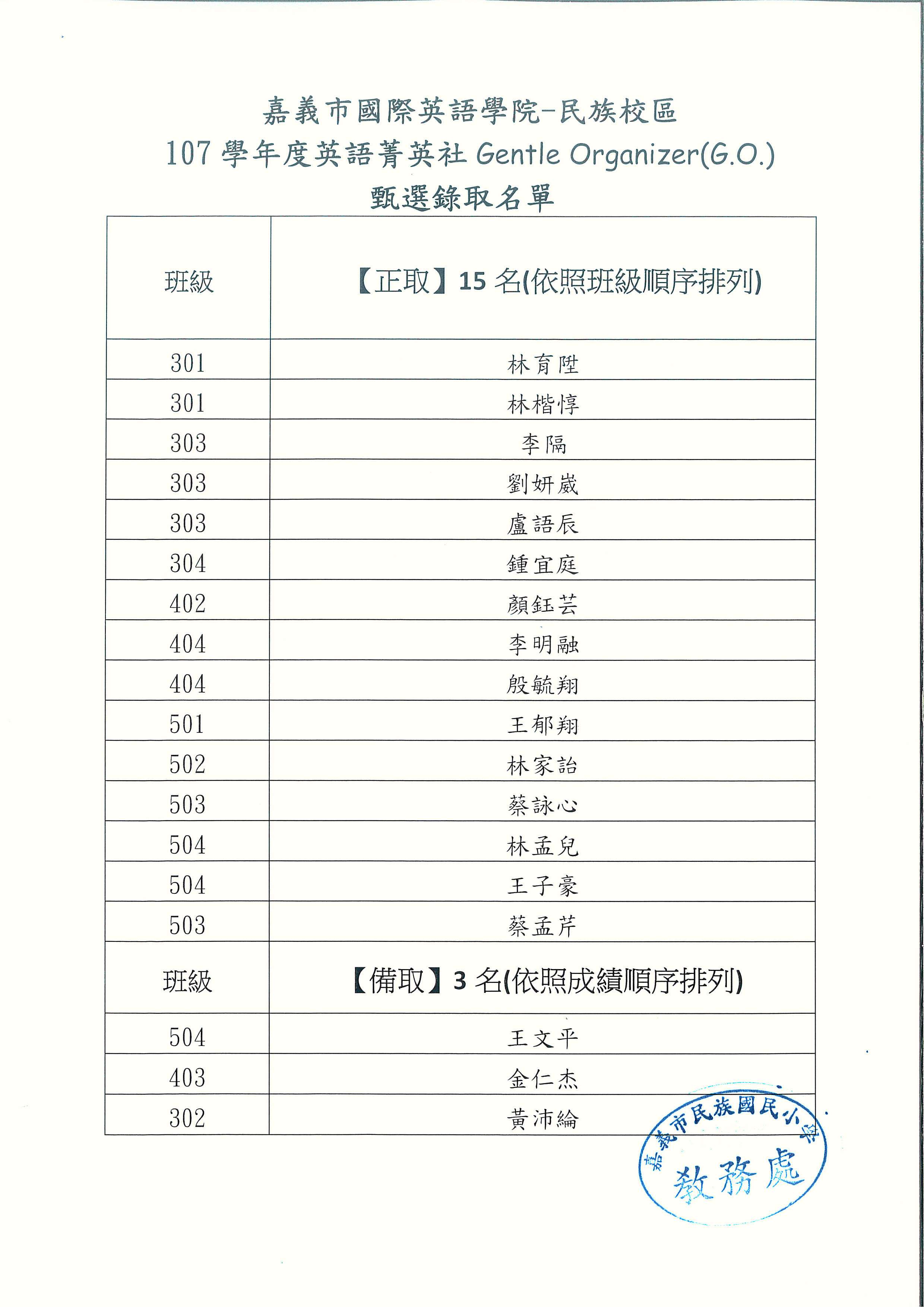 公告 107學年度英語菁英社Gentle Organizer(G.O.)甄選錄取名單