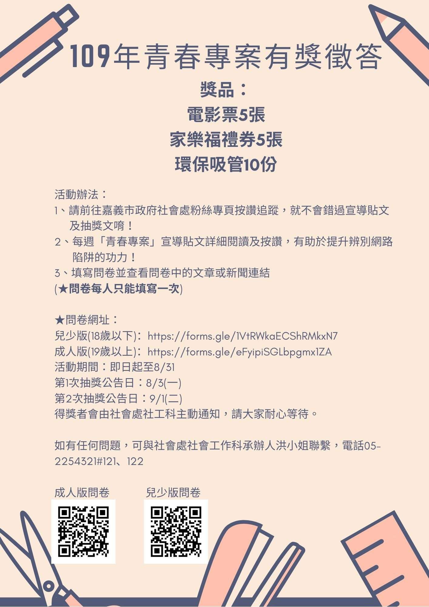 三、活動期間即日起至8月31日,欲瞭解更多關於青春專案宣導資源,請追蹤嘉義市政府社會處粉絲專頁,7-8月每週將有相關貼文宣導。