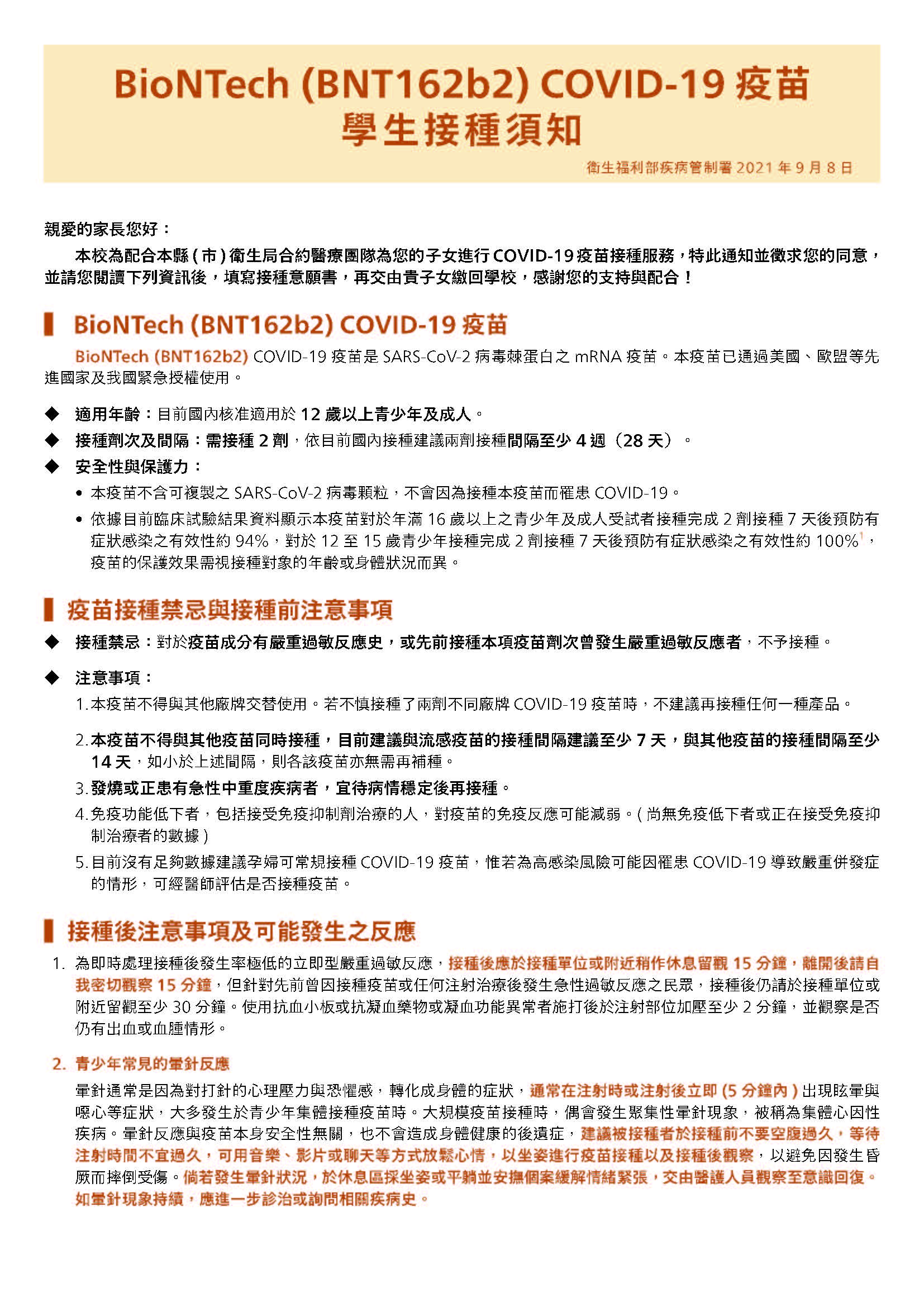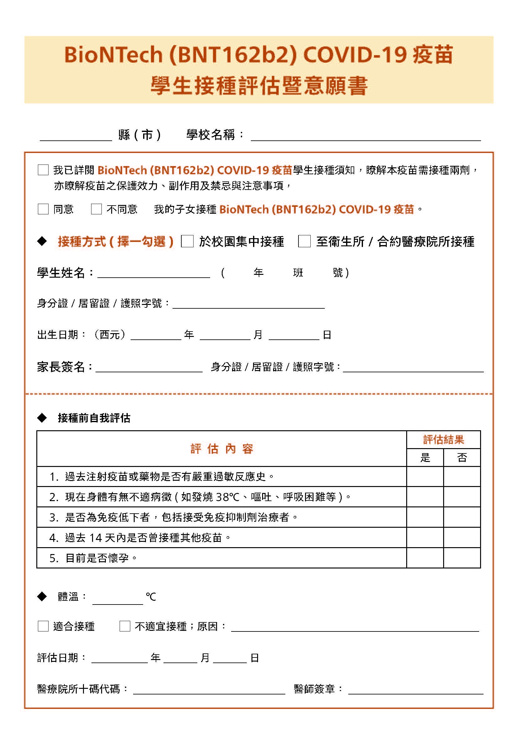 1.學生疫苗接種須經家長同意,需簽署「COVID-19疫苗接種通知說明及意願書」後,學生才可施打疫苗。