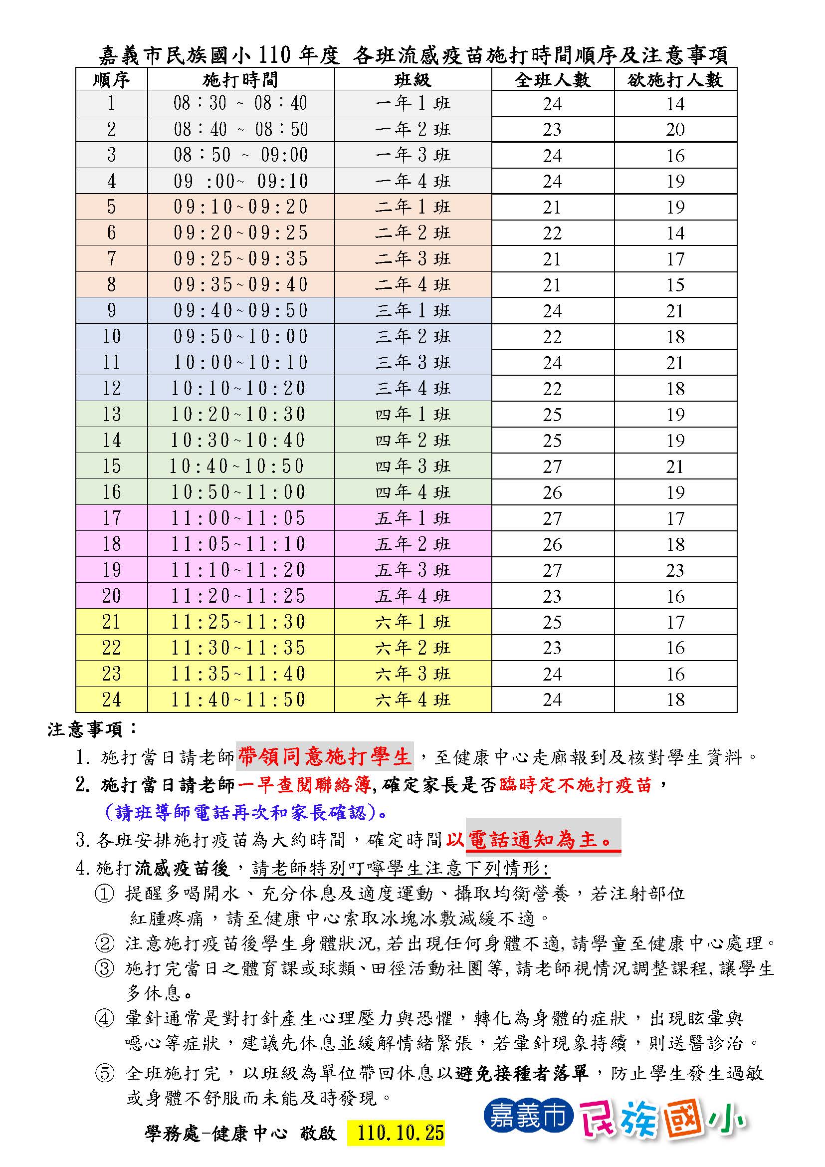 4、『接種後注意事項』單張會請學生帶回轉交家長。(於接種當日發下)