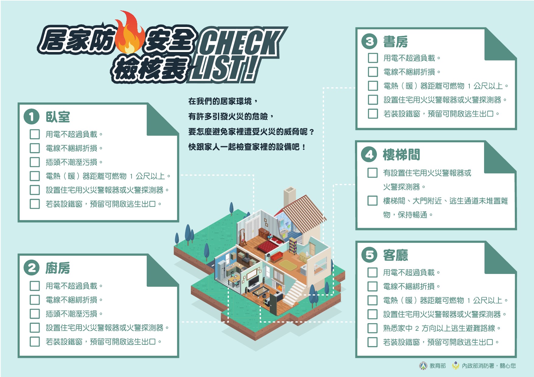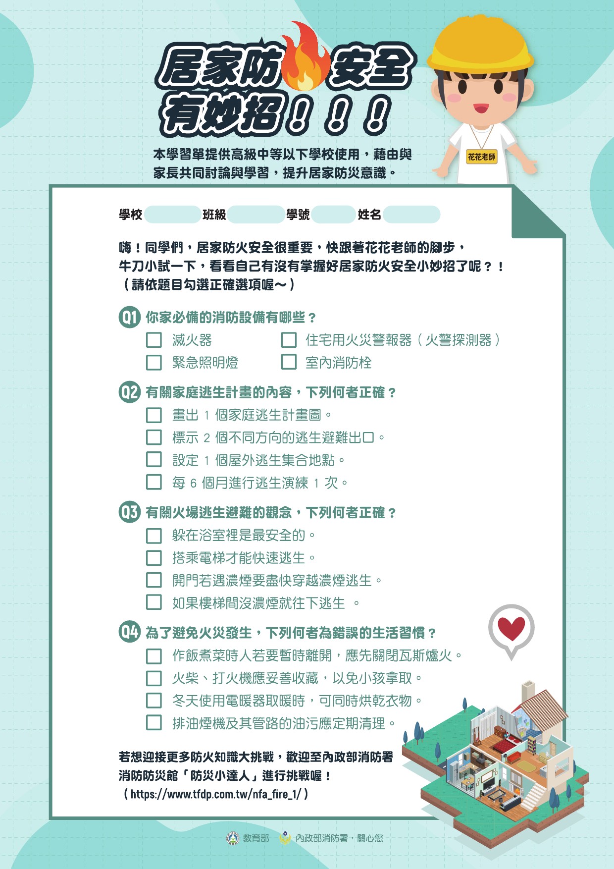 近年火災頻傳,造成民眾財產損失與人命傷亡,為加強宣導防火與防災觀念,喚起校園師生之居家防火安全意識,請善加運用旨揭學習單與檢核表,以提升防火知識與火災緊急應變能力。