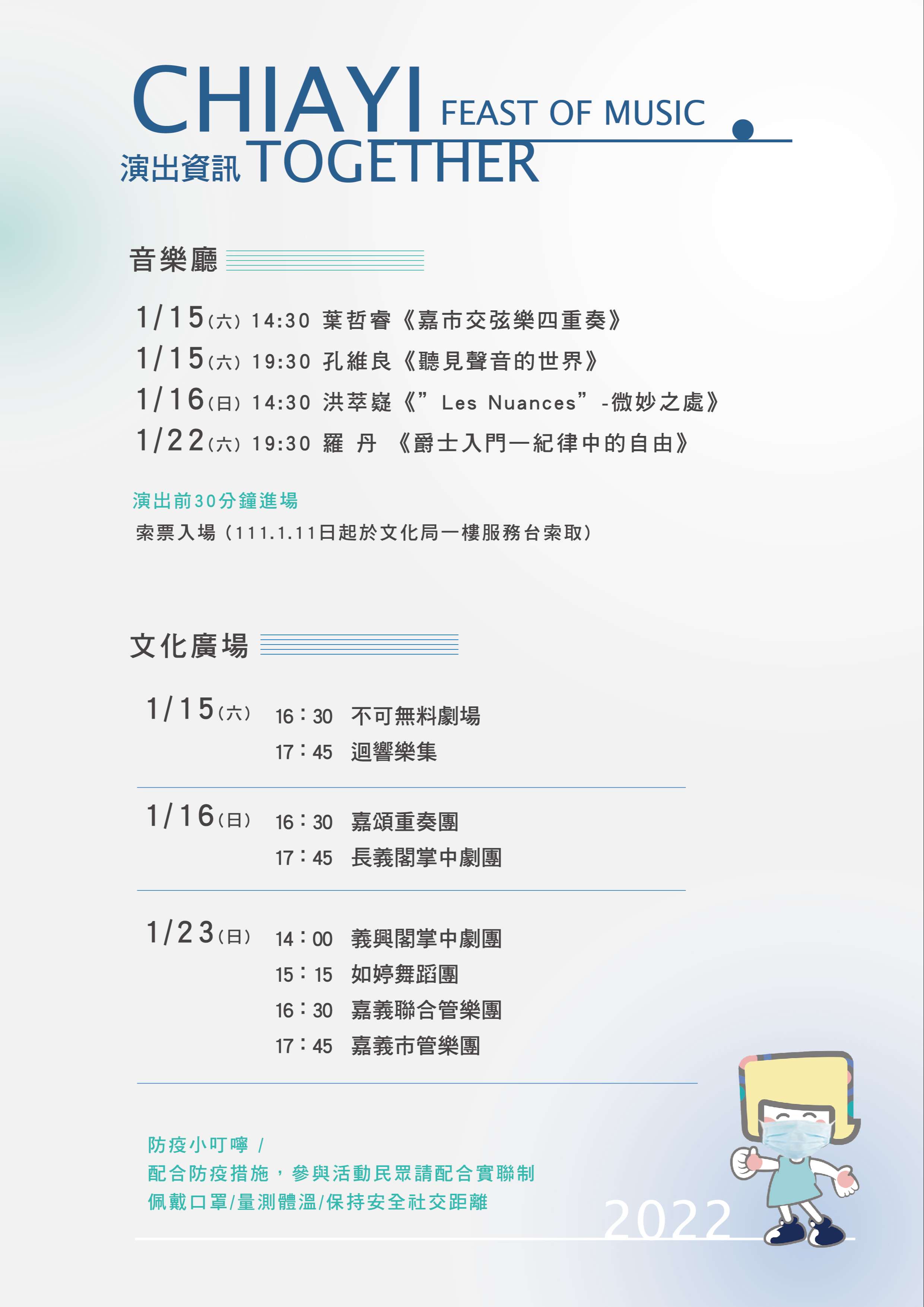一、旨揭活動於111年1月15日至23日在嘉義市政府文化局音樂 廳與文化廣場演出。
