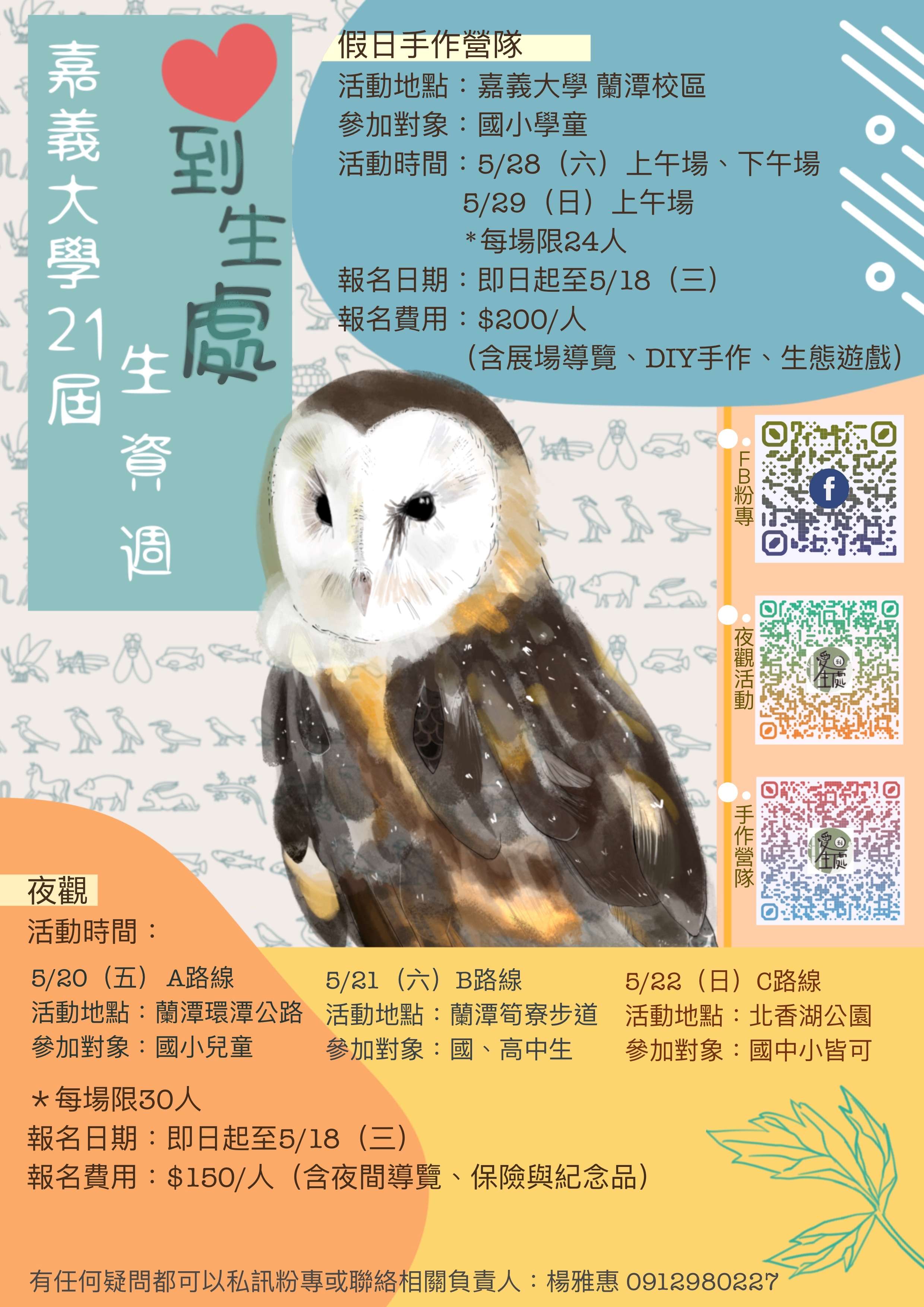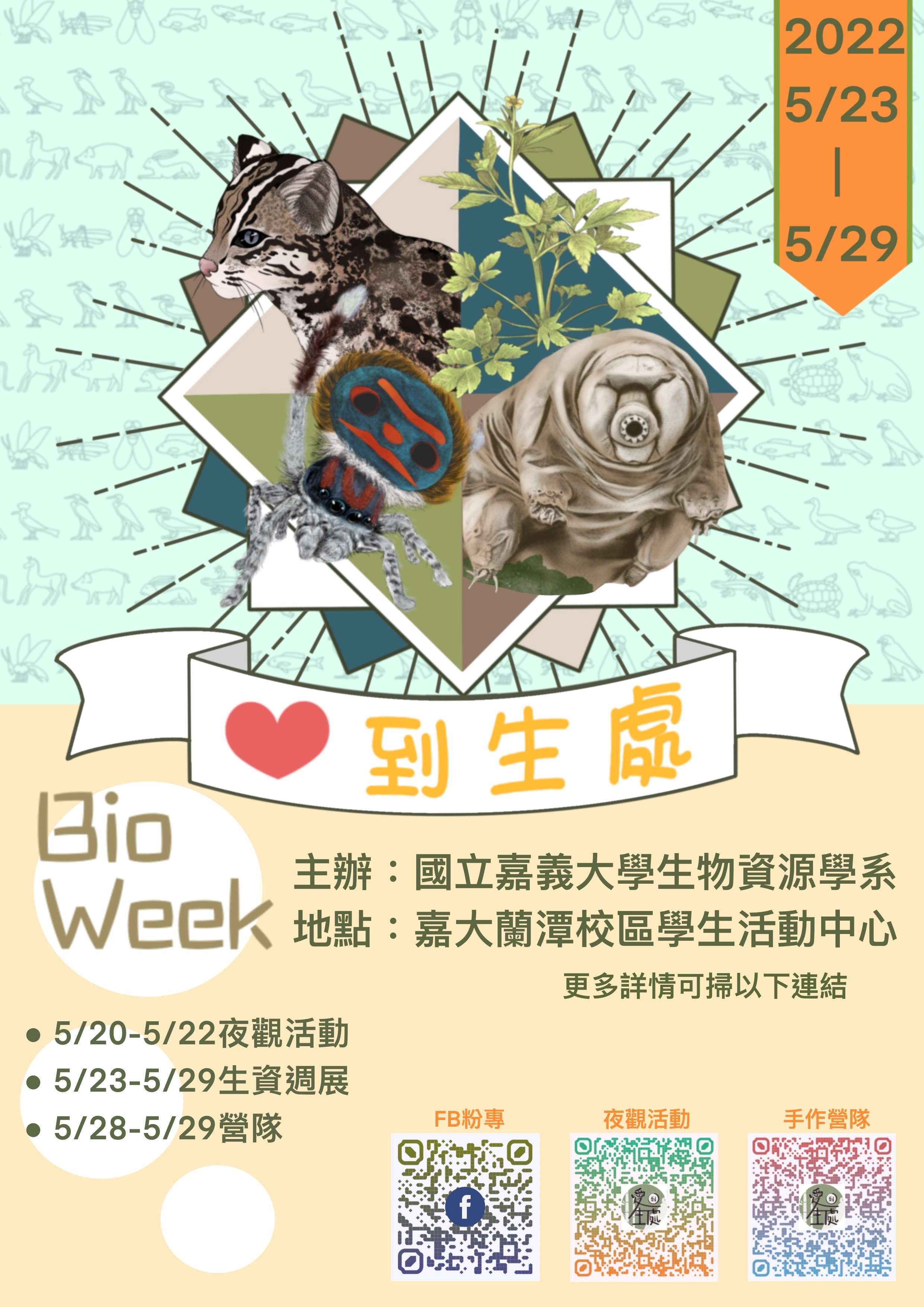 一、生物資源週活動為生資系年度重要學術教育活動之一,目 的為讓社會大眾及學生親身體驗生態環境之美並增進師生 互動,讓參與者了解生態環境與生態保育密不可分之關 係。