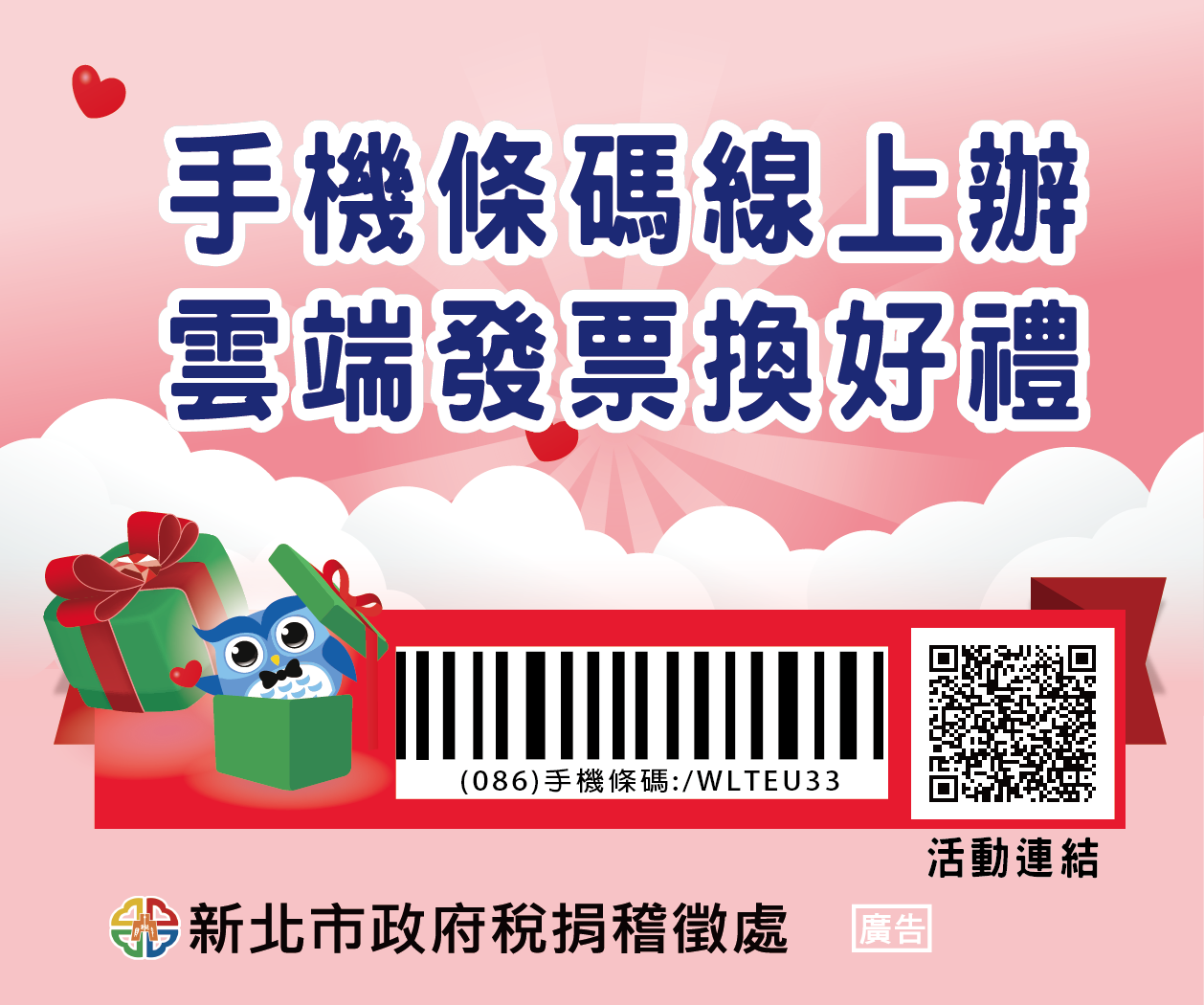 三、跑馬燈刊登文字如下:「新北市政府稅捐稽徵處官網提供 手機條碼線上辦及雲端發票換好禮服務,歡迎大家一起來 申請載具存發票,做捐贈拿好禮」。