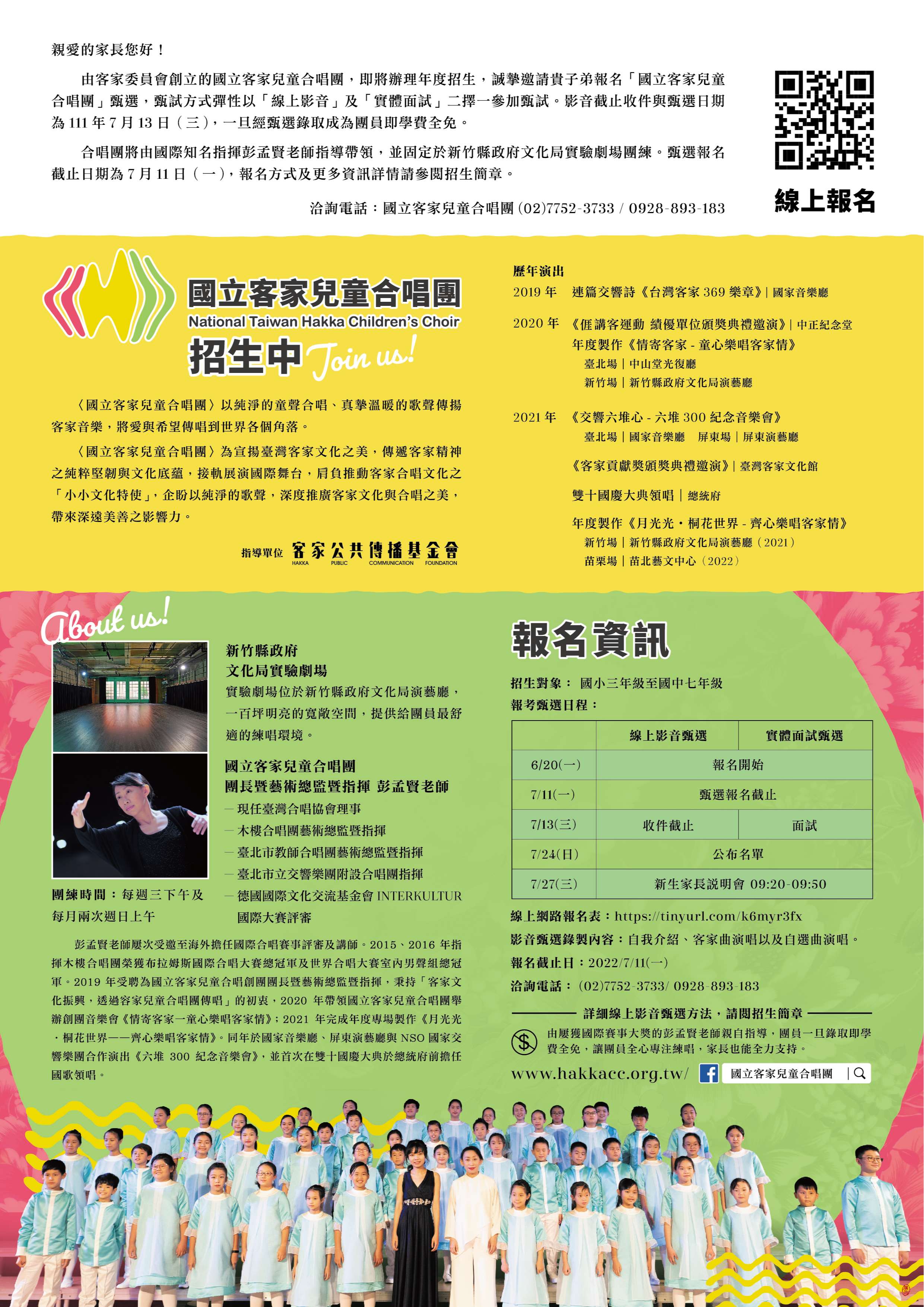 二、旨揭團員招生對象為國小三年級至國中七年級團員,甄選 方式採「線上影音」及「實體面試」二擇一,報名截止日 為111年7月11日(星期一),影音收件截止及實體面試甄 選日為同年7月13日(星期三),詳情請洽詢國立客家兒童 合唱團翁小姐,電話:(02)7752-3733/0928-893-183。