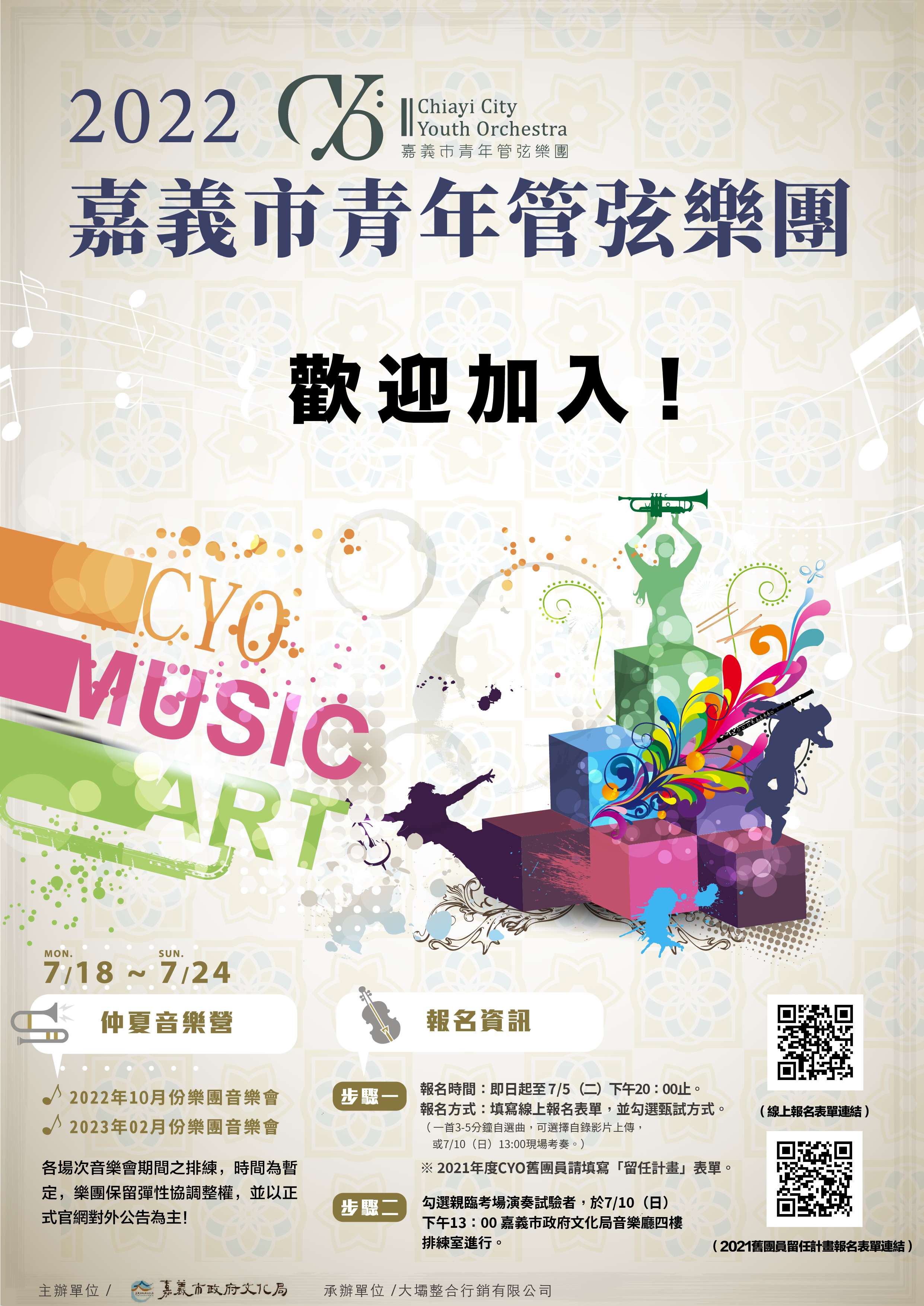 一、「2022嘉義市青年管弦樂團《仲夏音樂營》暨《年度音樂 會系列》」活動將於7月18日登場,即日起開放報名,歡迎 嘉義市青年學子踴躍參加。