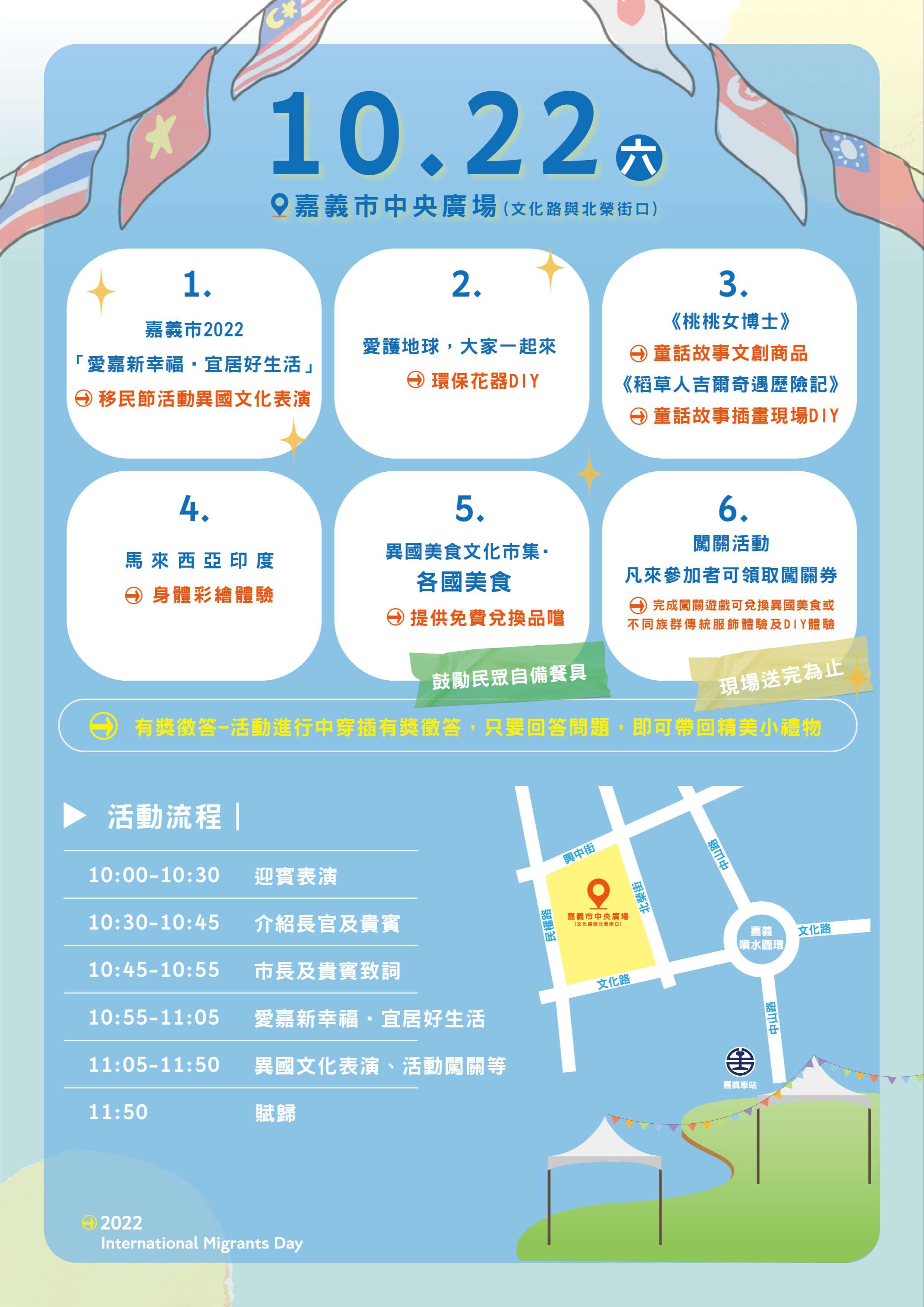 為有效宣導多元文化觀念,期藉此移民節慶活動,鼓勵家長帶領子女共同參與活動,並藉由欣賞異國歌舞表演、新住民成果展示、美食品嚐等活動,提升學生尊重、接納多元文化差異之素養,以培養寬廣之國際觀,營造溫馨友善之校園、建構多元文化社會。