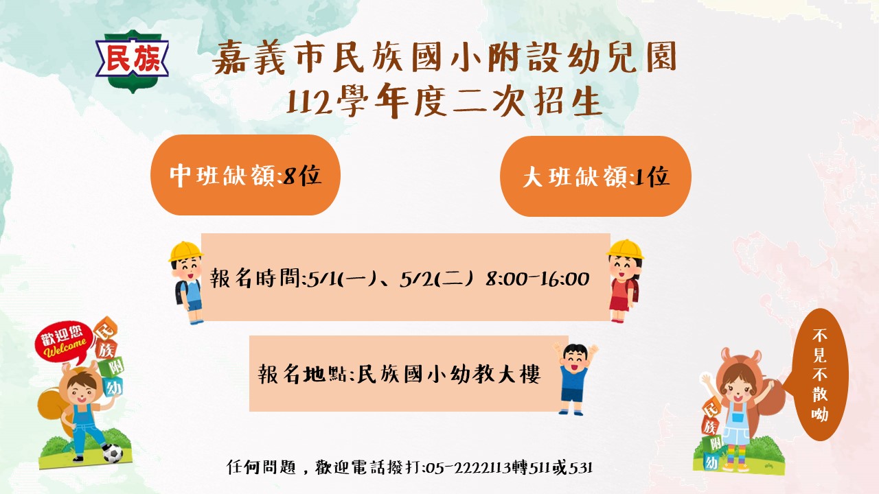 幼兒園112學年度第二次招生 名額僅剩中班 8 名 及 大班 1 名 ,要報名的動作要快喔 !