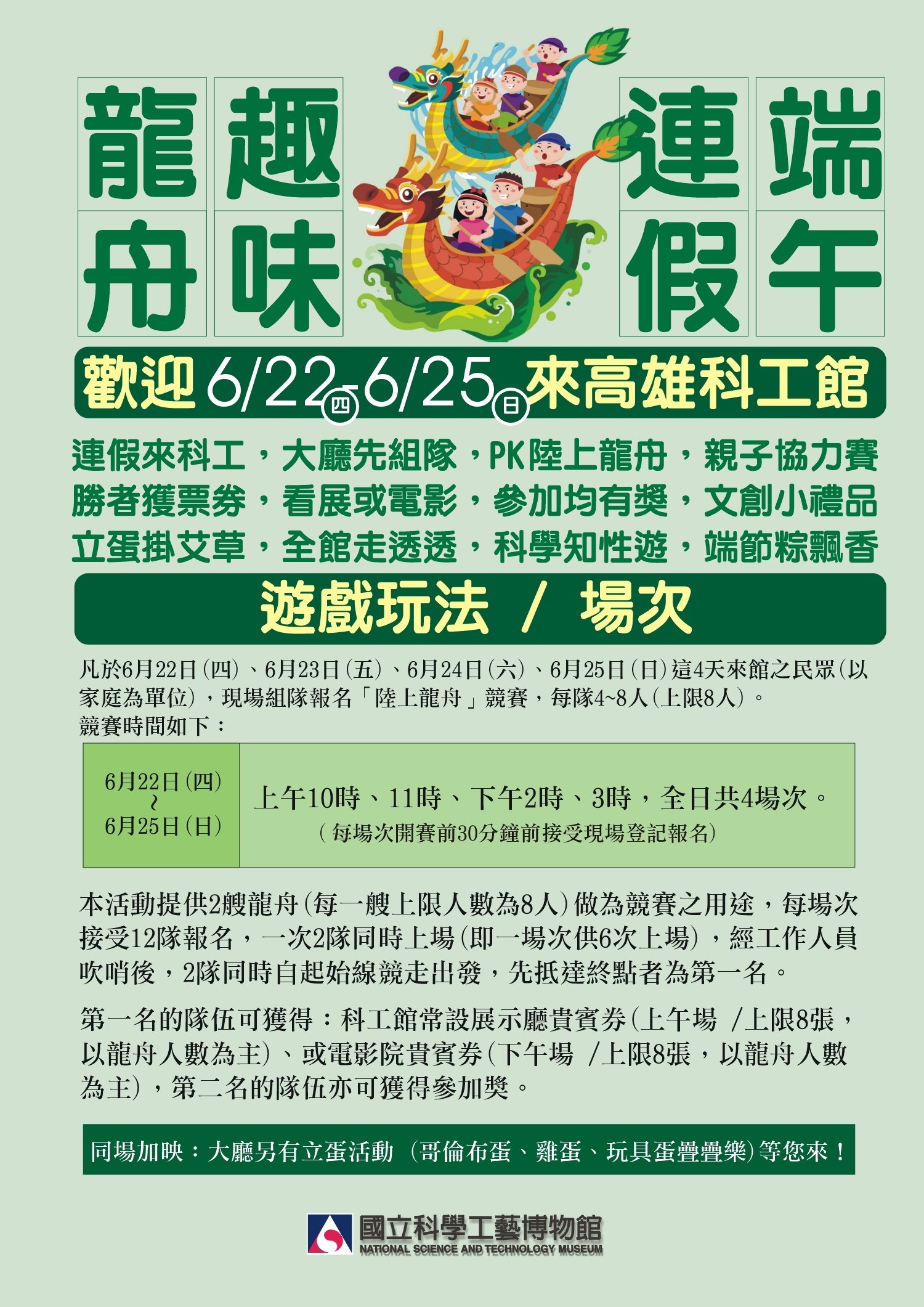 (一)時間:本年6月22日(週四)至6月25日(週五)端午連續假期科工館開館期間。