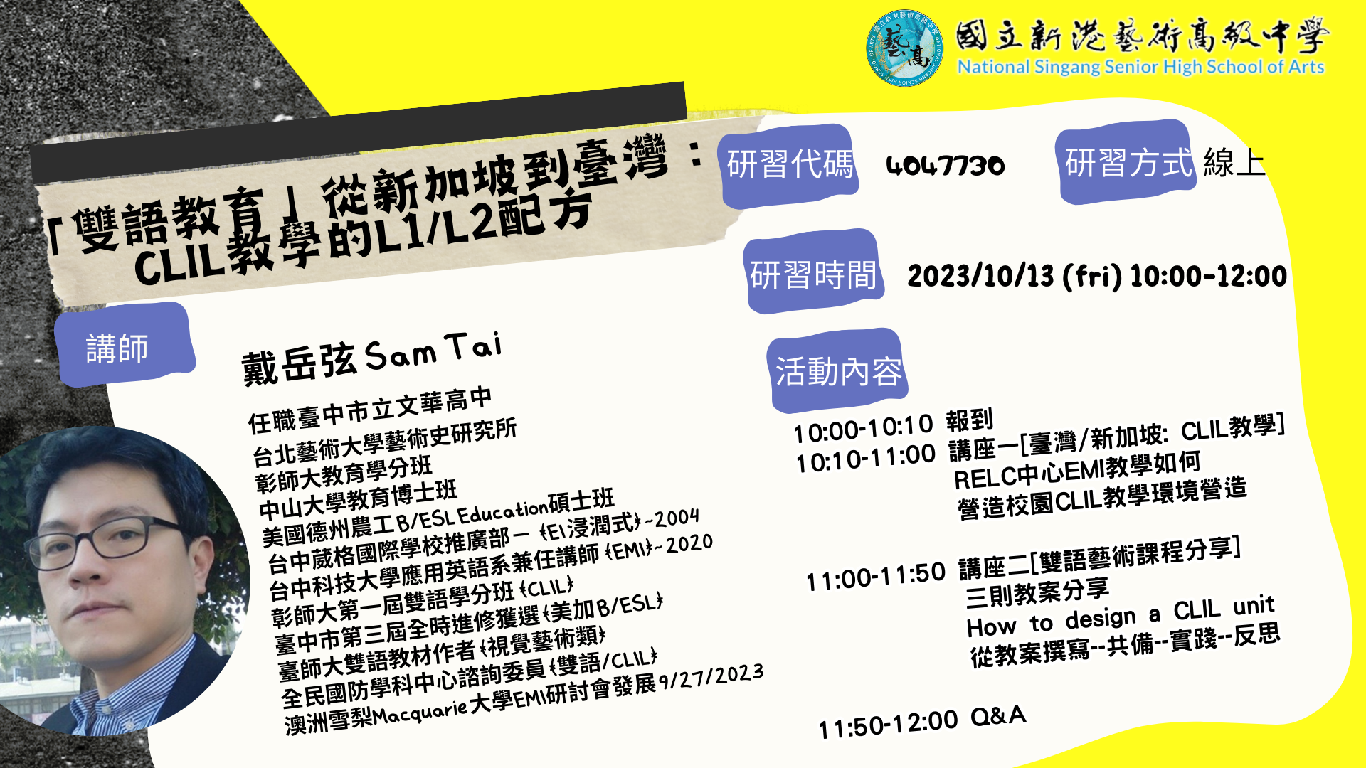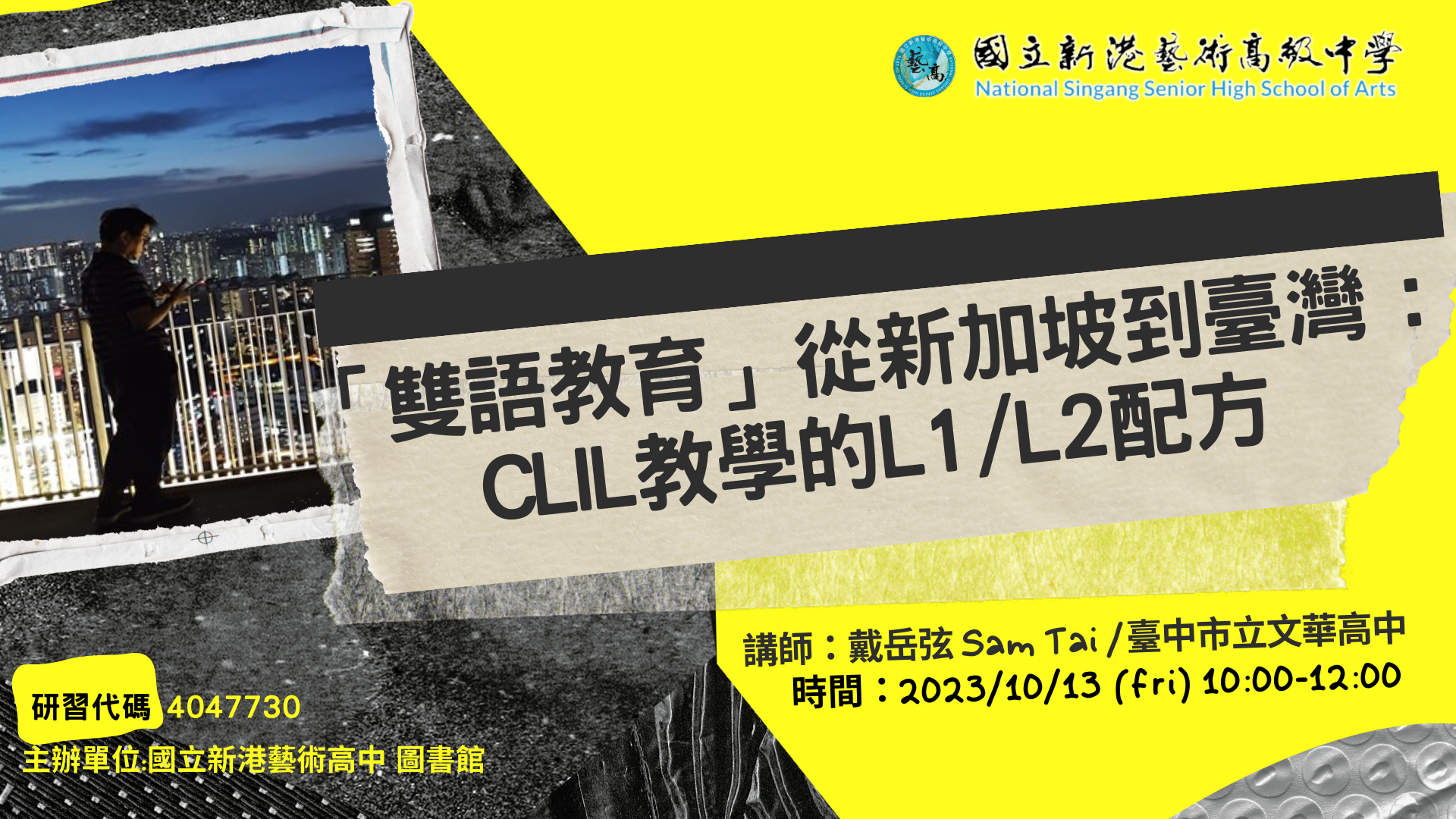 主旨:新港藝高辦理「從新加坡到臺灣: CLIL教學的L1/L2配方」線上講座資訊,鼓勵教師踴躍報名參加。