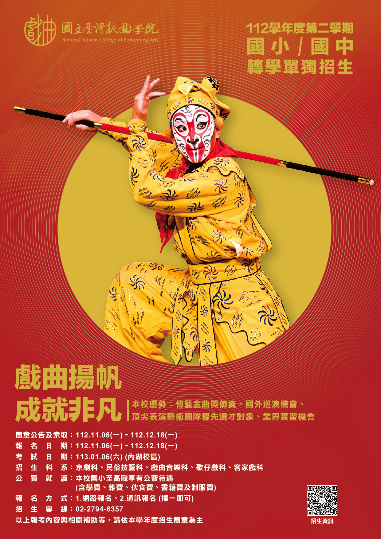 主旨:轉知國立臺灣戲曲學院112學年度第2學期國小及國中部轉學單獨招生訊息,請查照。