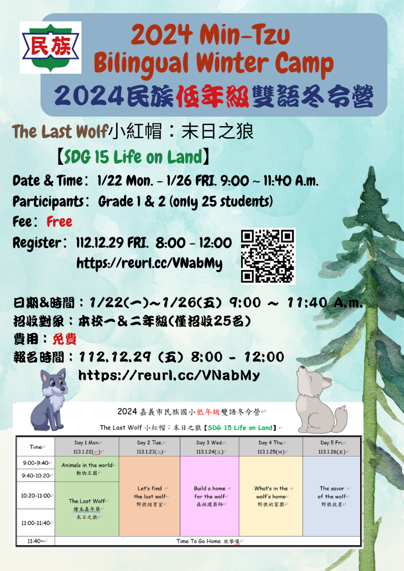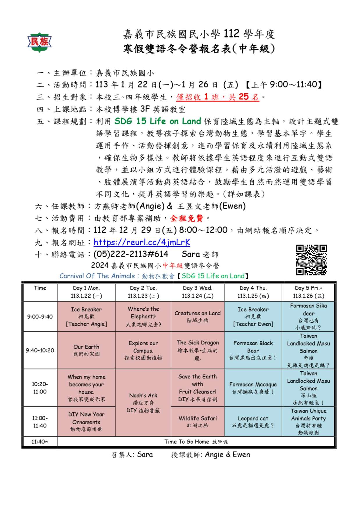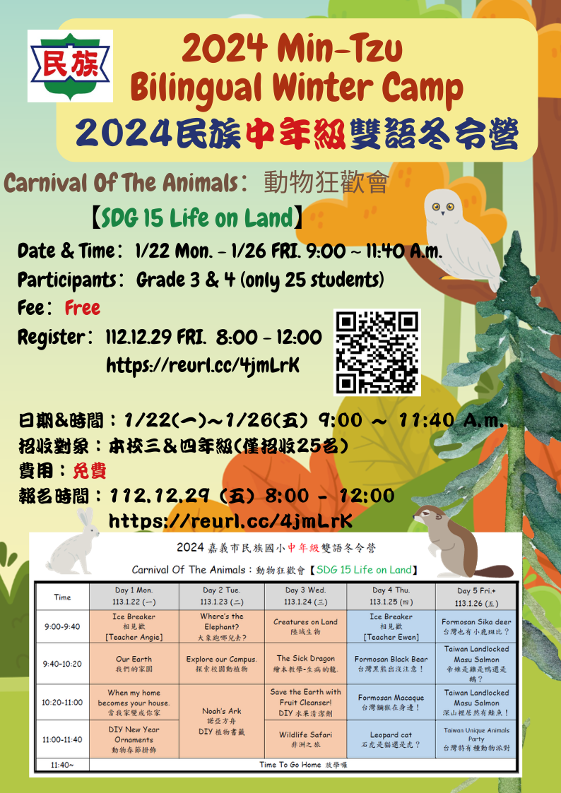 利用SDG 15 Life on Land保育陸域生態為主軸,設計主題式雙語學習課程,教導孩子探索動物生態,學習基本單字。學生運用手作、活動發揮創意,進而學習保育及永續利用陸域生態系,確保生物多樣性。教師將依據學生英語程度來進行互動式雙語教學,並以小組方式進行體驗課程。藉由多元活潑的遊戲、藝術、肢體展演等活動與英語結合,鼓勵學生自然而然運用雙語學習不同文化,提昇英語學習的樂趣。(詳如課表)