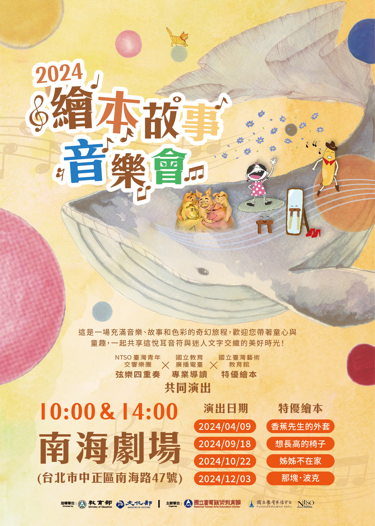 「2024年繪本故事音樂會」訂於2024年4月9日(星期二)、9 月18日(星期三)、10月22日(星期二)及12月3日(星期二)等 4日之上午10點及下午2點,合計8場次,於該館南海劇場 (臺北市中正區南海路47號)演出,誠摯邀請有興趣的師生 前來聆賞。
