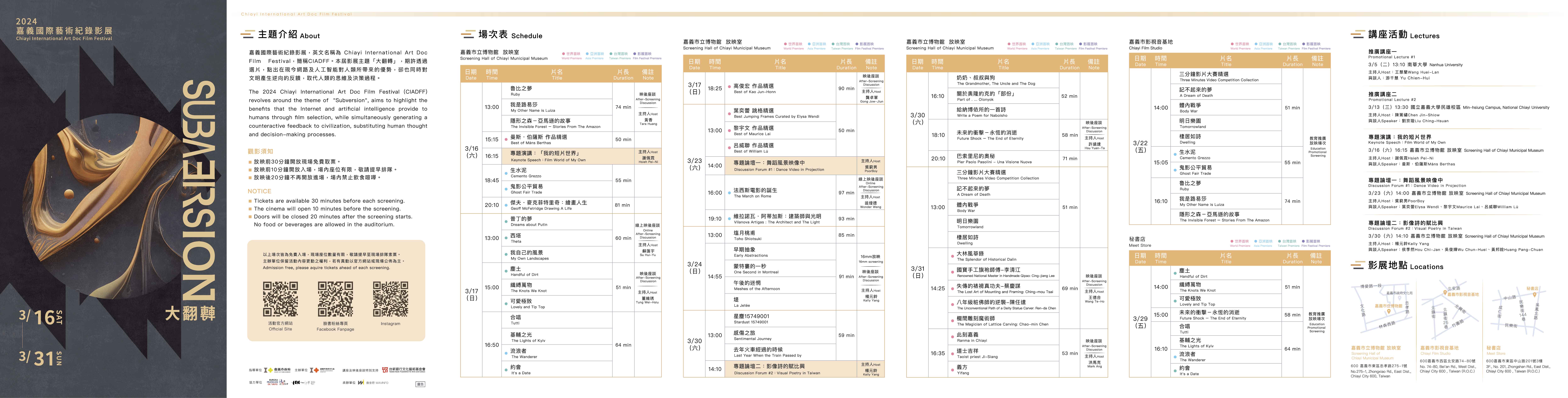 一、「嘉義國際藝術紀錄影展」自2014年創辦以來,長期致力 於藝術文化推廣,今年影展邁入第11年,特別以「大翻 轉」為主題,探討現今網路及人工智能對人類所帶來的優勢,卻也同時對文明產生逆向的反饋,取代人類的思維及決策過程。