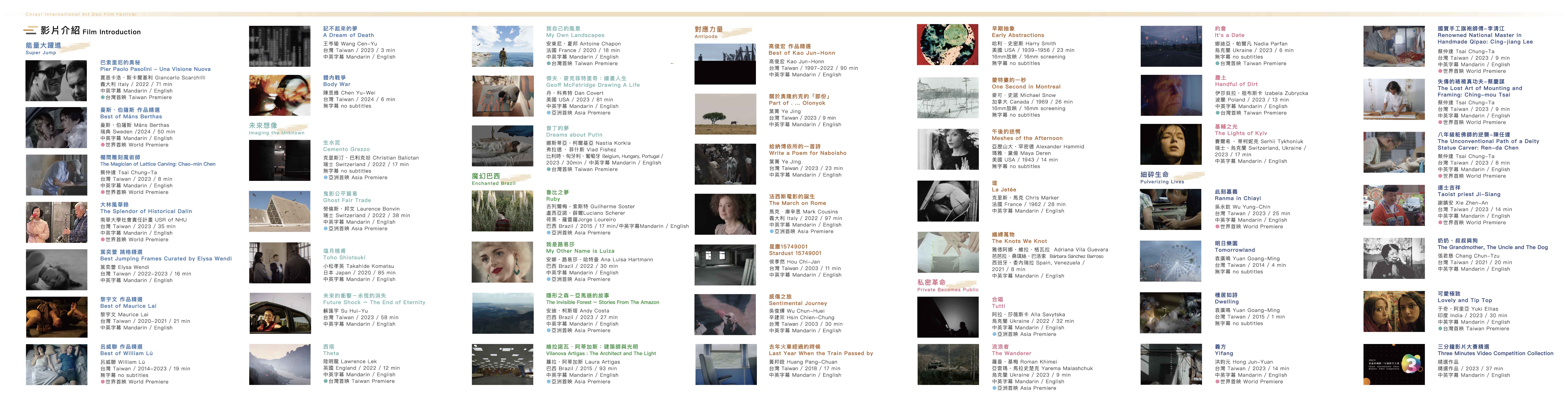 二、今年影展匯集巴西、瑞士、烏克蘭、義大利、日本等18個 國內外藝術紀錄片參展,彙集49部國內外優秀藝術紀錄 片,其中包含13部世界首映、7部亞洲首映、6部台灣首 映,並舉辦1場專題演講、2場專題論壇、9場映後座談,自 3月16日起至3月31日,每周六日於嘉義市立博物館放映室陸續上映,教育推廣場場次則於影視音基地以及秘書店放映,所有場次皆免費入場,更多活動訊息,請至活動網站(https://www.2024.chiayi.film/)與Facebook粉絲專頁 (https://www.facebook.com/ciadff)及Instagram (https://www.instagram.com/ciadff)查詢,請貴校協 助公告宣傳並鼓勵師生踴躍參與。