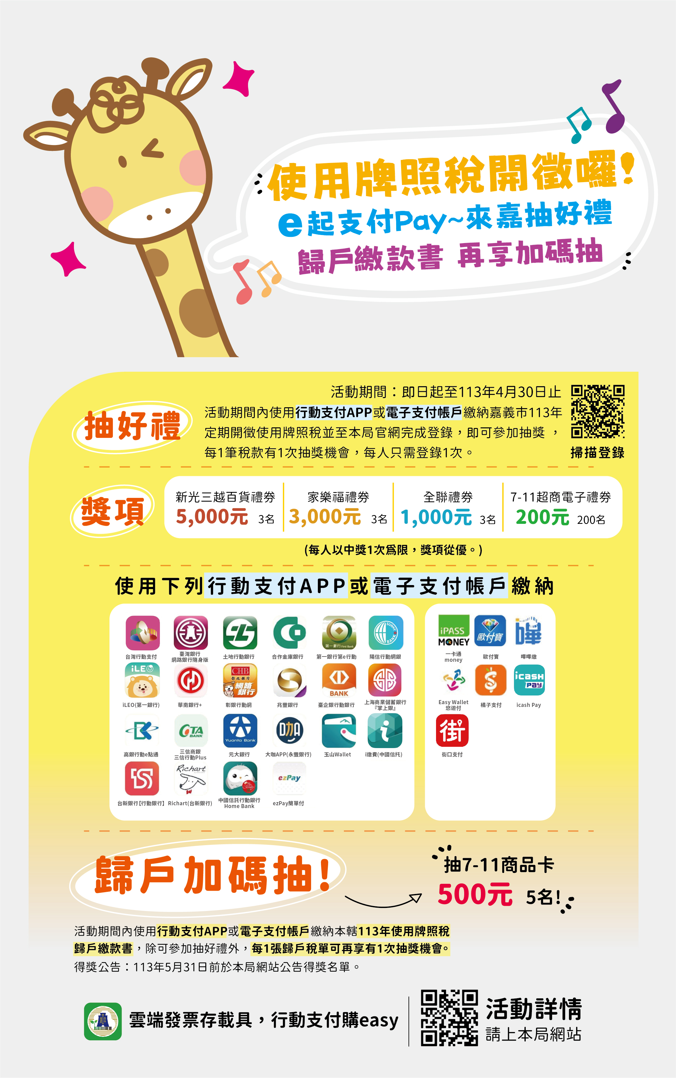 (三)「e起支付Pay 來嘉抽好禮」,4月30日前以行動支付或電子支付繳納本市開徵使用牌照稅並至市府財稅局網站完成登錄即可參加抽獎,已歸戶繳款書再享加碼抽;新