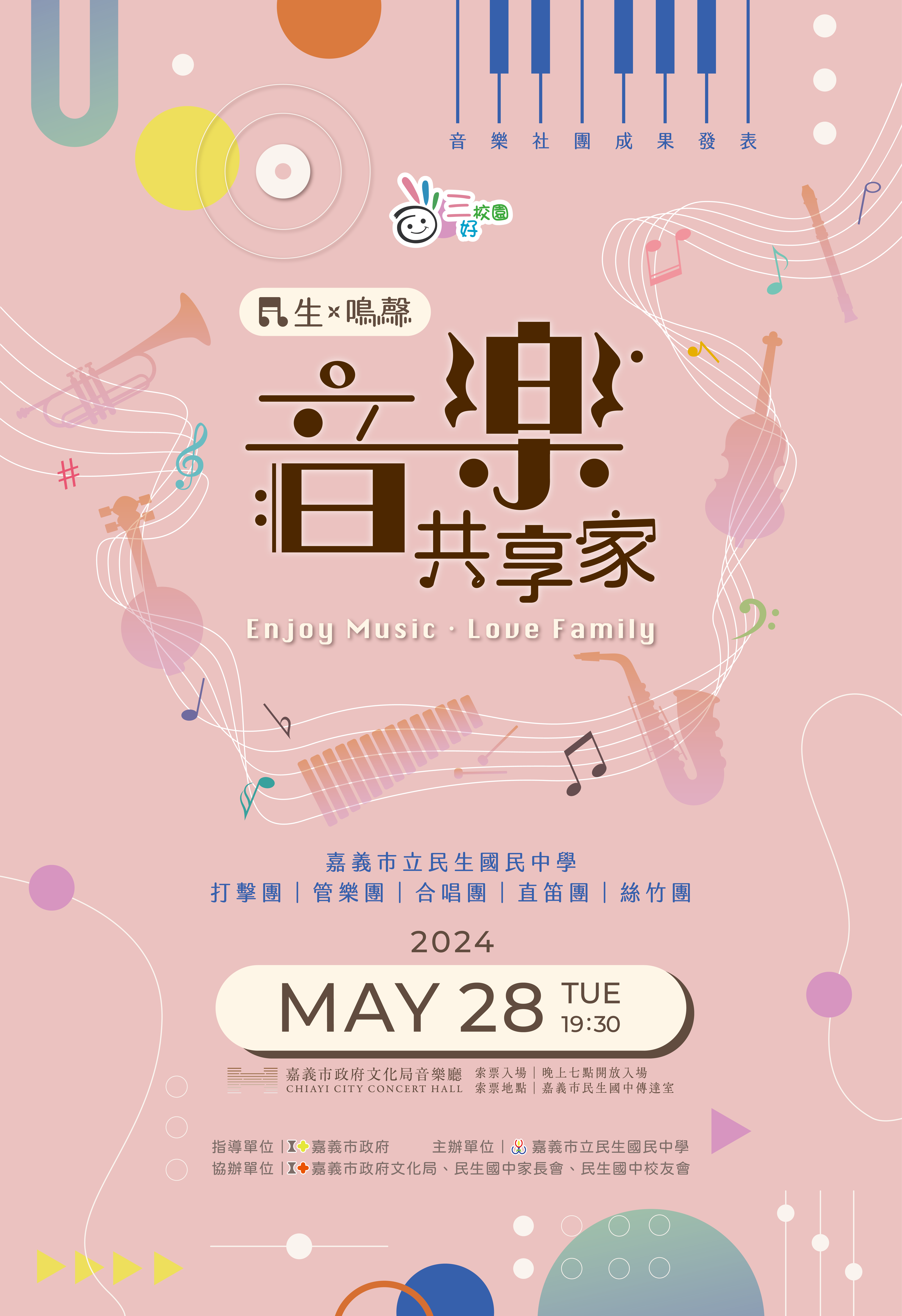 一、2024年嘉義市民生國中「民生‧鳴聲‧音樂共享家」音樂社團成果發表會,將呈現打擊樂團、管樂團、合唱團、直笛團、絲竹團之不同風格的音樂作品。誠摯邀請音樂愛好者蒞臨觀賞。