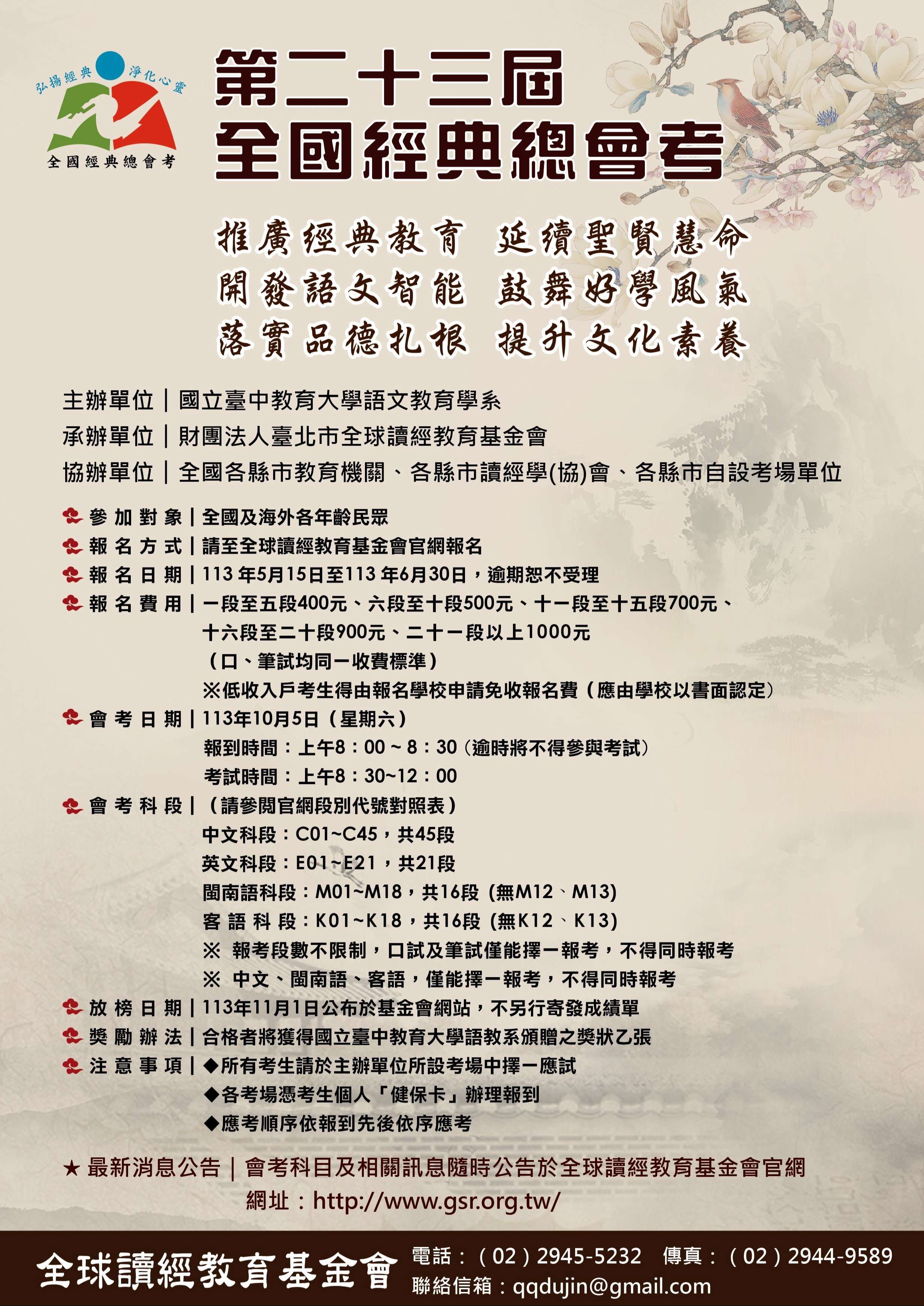 二、第23屆全國經典總會考將於113年5月15日開始報名,113年10月5日考試。