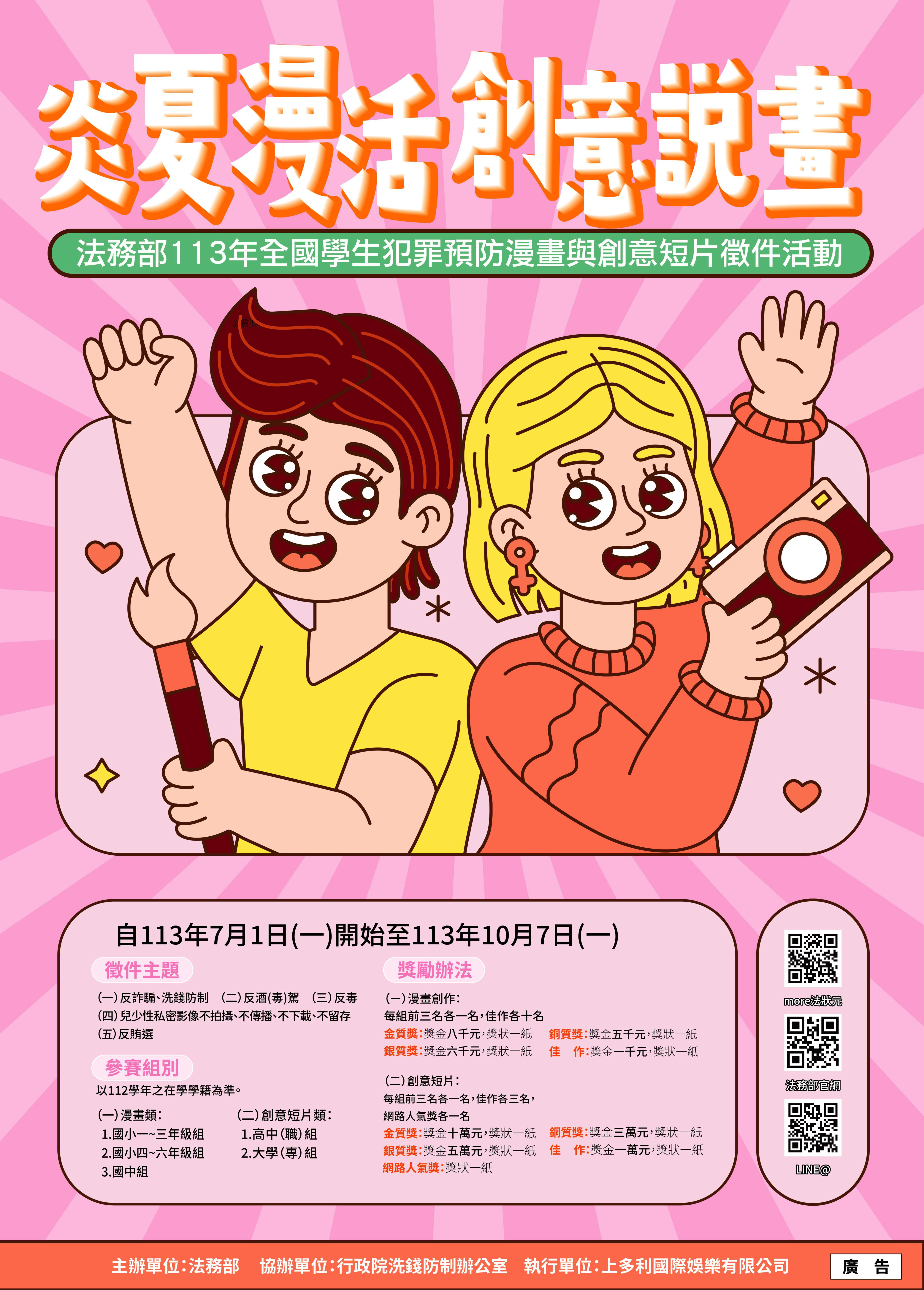 二、本年度徵稿期間自113年7月1日至10月7日,採線上報名。有關徵稿活動相關訊息及報名資料下載,請於7月1日至下列網站搜尋:活動官網(https://www.mojgov2024.com.tw/)、法務部「More法狀元」網站(https://tpmr.moj.gov.tw)「年度活動」或facebook搜尋:More法狀元-兒童及青少年犯罪預防宣導網。