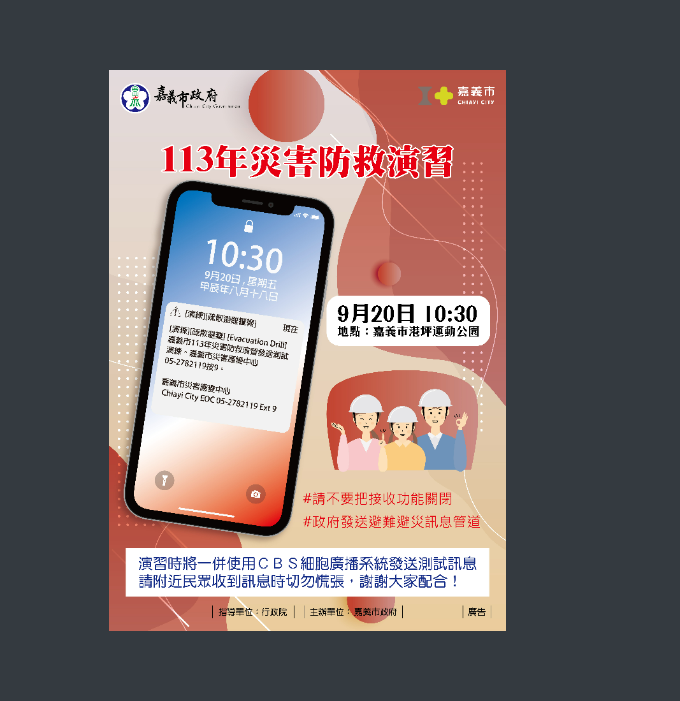 嘉義市113年災害防救演習訂於9月20日上午10時至12時舉辦,期間為符合實際災況結合發送災防告 警細胞廣播服務訊息演練,發布地點在本市西區大同路320號港坪運動公園一帶,屆時手機如有收到告警訊息請不要驚慌。