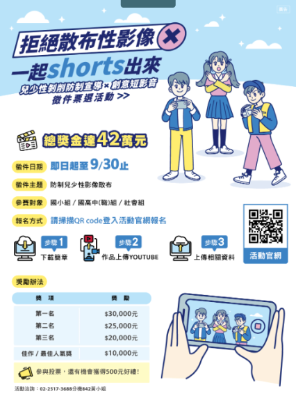衛生福利部辦理「拒絕散布性影像 一起shorts出 來」創意短影音徵件活動,請學生、家長及教師踴躍報名參加。
