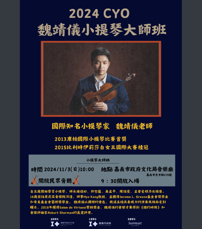 2024嘉義市青年管弦樂團「魏靖儀小提琴大師 班」將於113年11月3日(星期日)上午10時於音樂廳舉行