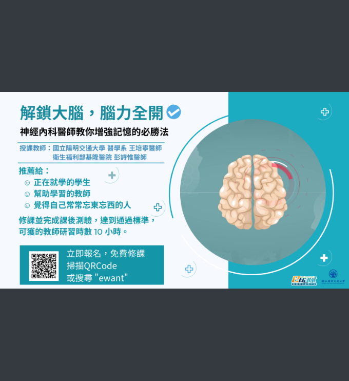一、旨揭課程由本校醫學系王培寧醫師與基隆醫院彭詩惟醫 師,製作「解鎖大腦,腦力全開」全線上數位課程,傳遞 活用大腦的正確認知,打造有效的學習方法。