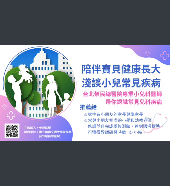 一、旨揭課程由本校醫學系小兒科楊令瑀醫師,邀集台北榮民 總醫院的專業醫師群,以常見小兒科疾病為主題,製作 「陪伴寶貝健康長大:淺談小兒常見疾病」全線上數位課 程,以利推動正確的小兒衛教資訊,共同打造更安全的育 兒環境。