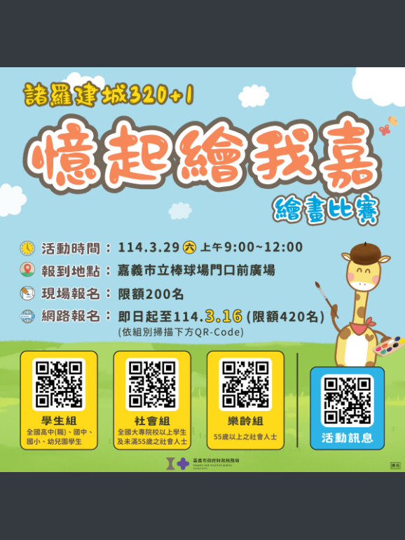 三、報名方式: (一)網路報名(限額420名):即日起至114年3月16日(星期 日)止,報名網址如下(本局官網首頁>公告資訊>宣導 專區>租稅比賽及講習線上報名>活動報名) 1、學生組:https://gov.tw/YEc 2、社會組:https://gov.tw/Hue 3、樂齡組:https://gov.tw/zgu 4、報到時間:活動當日8:30起依組別領取比賽用紙(以報名時填寫之手機號碼末三碼為報到編號)。 5、網路報名並於當日收件時間內繳交作品者,額外贈送 全家便利商店商品卡100元1份。 (二)現場報名(限額200名):活動當日8:30起於服務台依 序報到領取比賽用紙。 (三)報名樂齡組者,報到時須出示身分證或健保卡驗證參賽 資格。 四、採當日收件比賽,參賽者每人限領取1張比賽用紙,參賽作 品須為參賽者個人於活動現場完成之作品,並於活動當日 上午12:00前完成,依參賽組別將作品繳回,凡完成交件 者,均可獲贈1份精美宣導品。