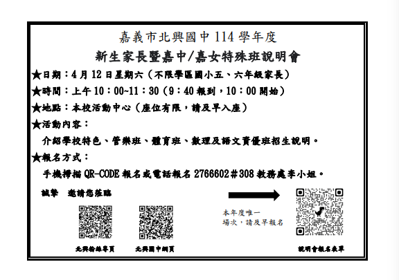 二、日期:4月12日星期六(不限學區國小五、六年級家長)