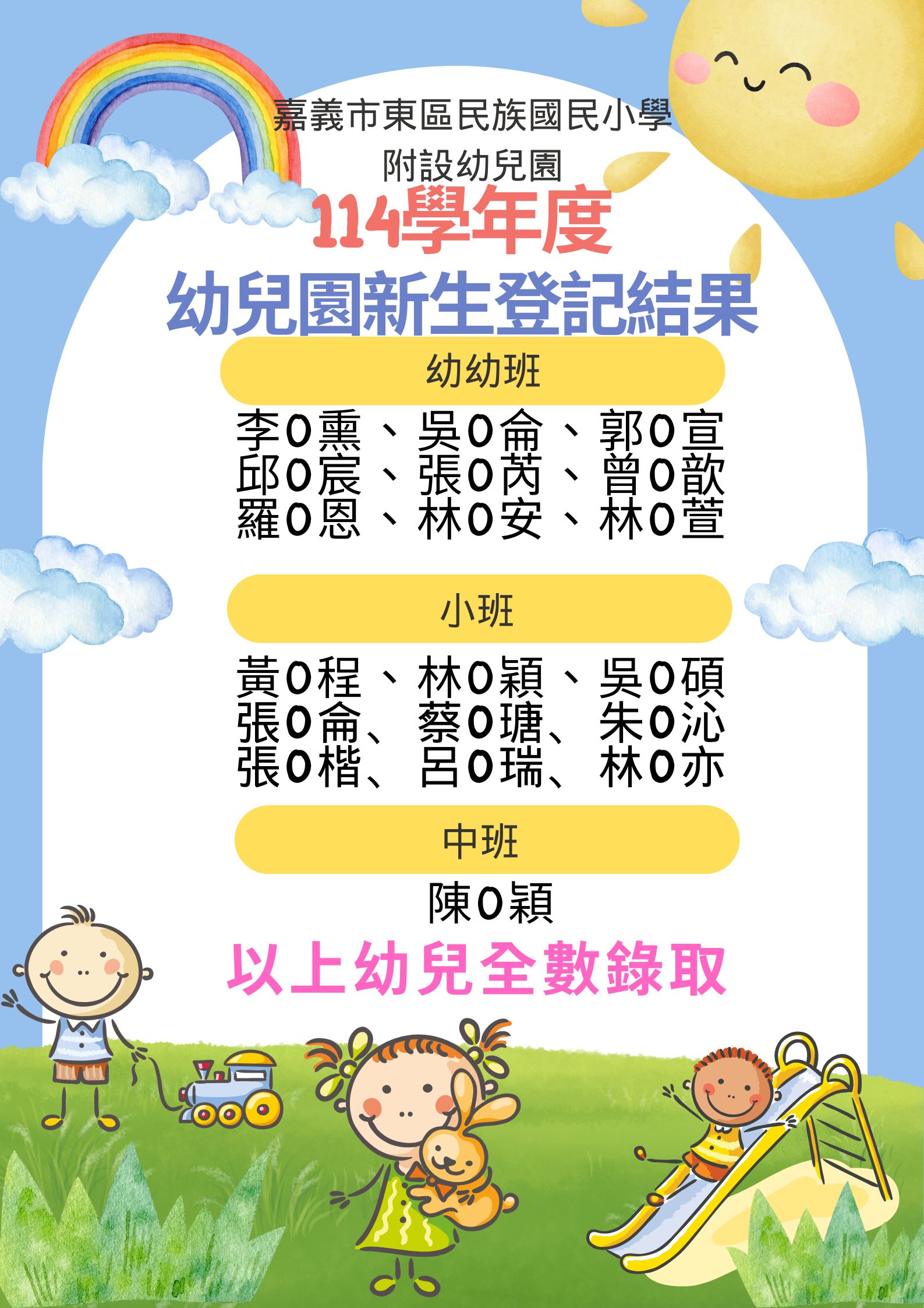 1.中班及幼幼班登記名額全數錄取。