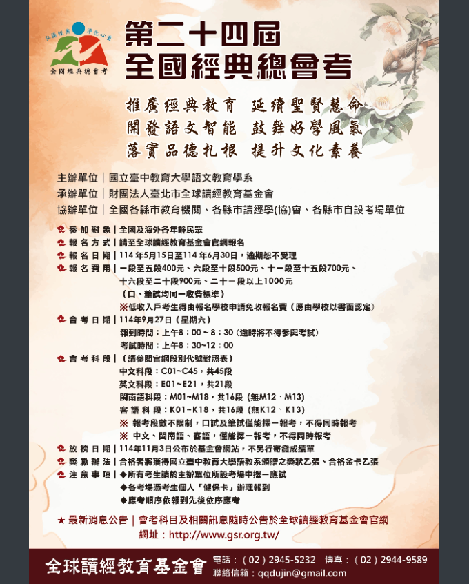第24屆全國經典總會考將於114年5月15日開始報名, 114年9月27日考試。
