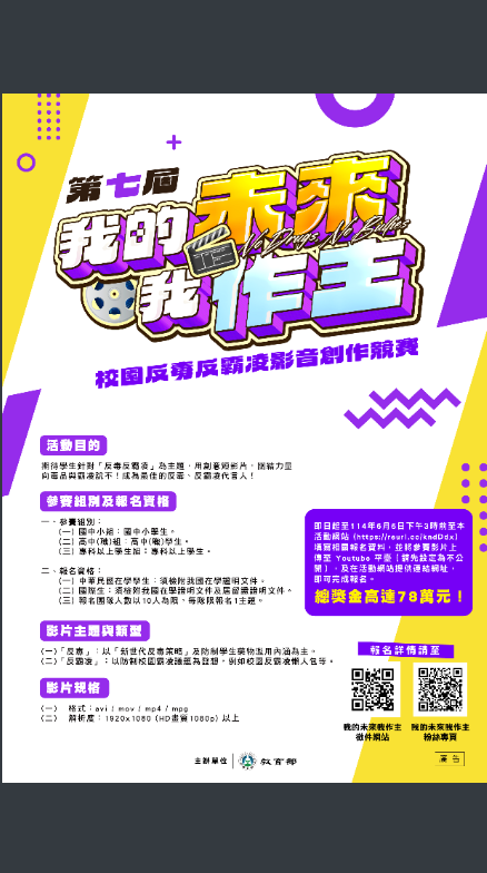 三、詳細競賽資訊請至「我的未來我作主」徵件網站 (https://reurl.cc/kndDdx)以及「我的未來我作主」FB 粉絲專頁(www.facebook.com/antidrug.edu/)查詢,或 洽詢承辦單位太乙廣告行銷股份有限公司,電話:(02) 8913-1111分機212。