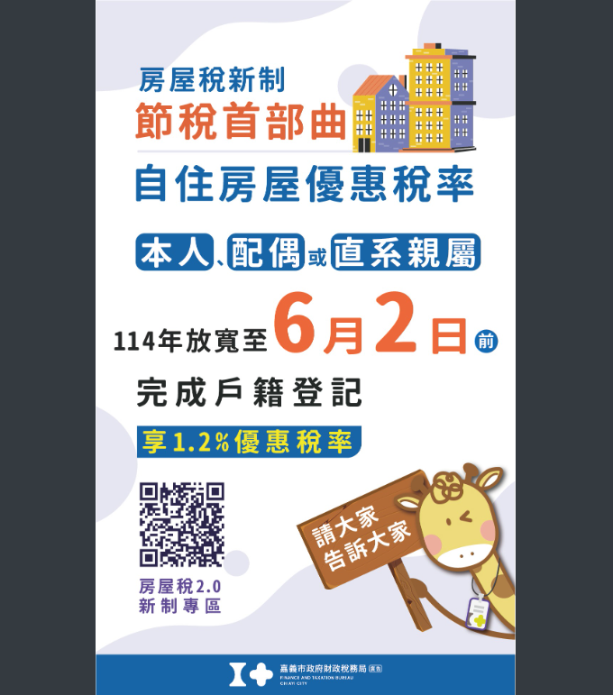 房屋稅新制首次開徵,自住用房屋設戶籍及申報期 限放寬至114年6月2日,詳情請洽嘉義市政府財政稅務局 (廣告)。