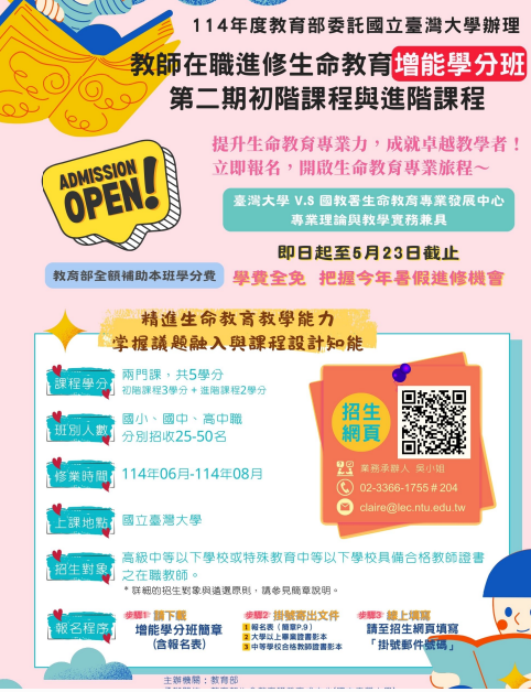 教育部委託國立臺灣大學辦理「114年度教師在職進 修生命教育增能學分班」