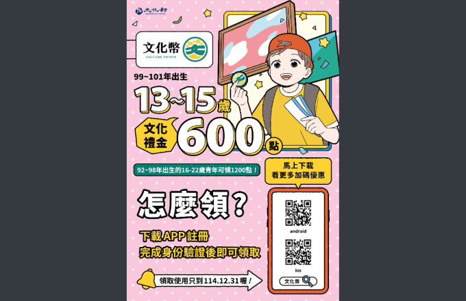 為鼓勵青少年參與藝文活動,並促進藝文產業發展,文化 部自112年起發放文化禮金,今(114)年文化禮金持續發 放16~22歲每人1,200點文化幣,並同時推廣13~15歲試辦計 畫,每人發放600點文化幣,使用期間自114年1月1日至114 年12月31日止。