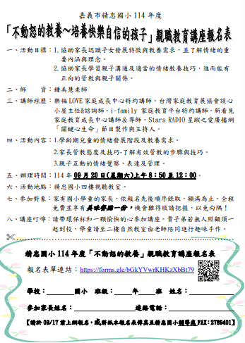 精忠國民小學辦理「114年度家庭教育中心親職教育講座-不動 怒的教養~培養快樂自信的孩子」活動報名表乙份,敬請家長踴躍參加。