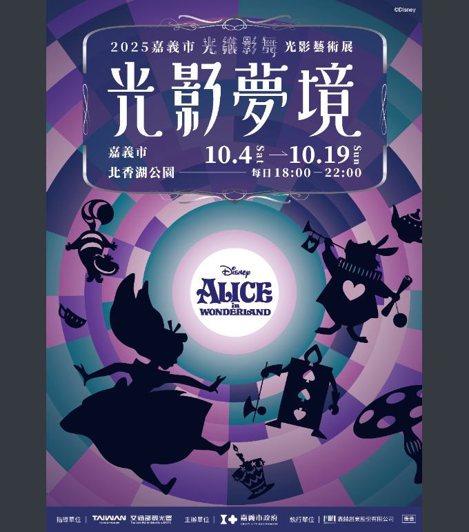 「2025嘉義市光織影舞」將在10月4日至10月19日奇幻登 場,今年再度展現吸睛創新手法,以超過150年歷史、家喻 戶曉的迪士尼經典動畫《愛麗絲夢遊仙境》為活動主題, 規劃8大光影藝術展區,打造30米長如夢似幻的沉浸式光環 隧道、9米高的愛麗絲造型氣偶,並在北香湖面打造4.5米 高多層次轉動的月亮等,結合城市場域,打造專屬嘉義市 的奇幻入口。