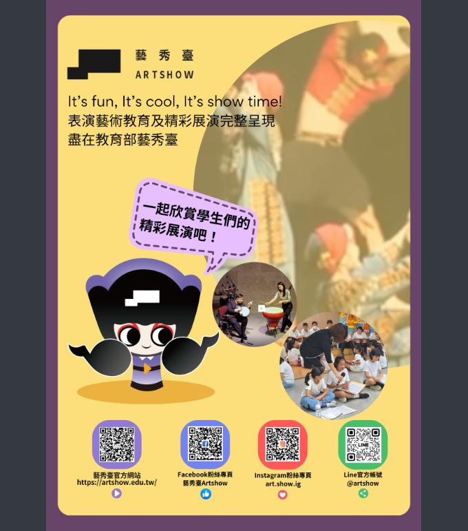「藝秀臺」將持續提供優質展演及表演藝術教育推廣內 容,更多精采影片,請至「藝秀臺」網站,或至「藝秀 臺」臉書粉絲專頁:臉書搜尋「藝秀臺ArtShow」、官方 IG:搜尋「art.show.ig」關注即時訊息。