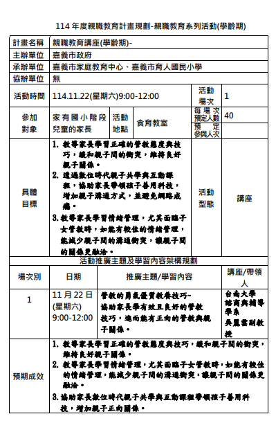育人國民小學辦理「114年度家庭教育中心親職教育講座-管教 的勇氣-優質教養技巧」請 家長踴躍參加。