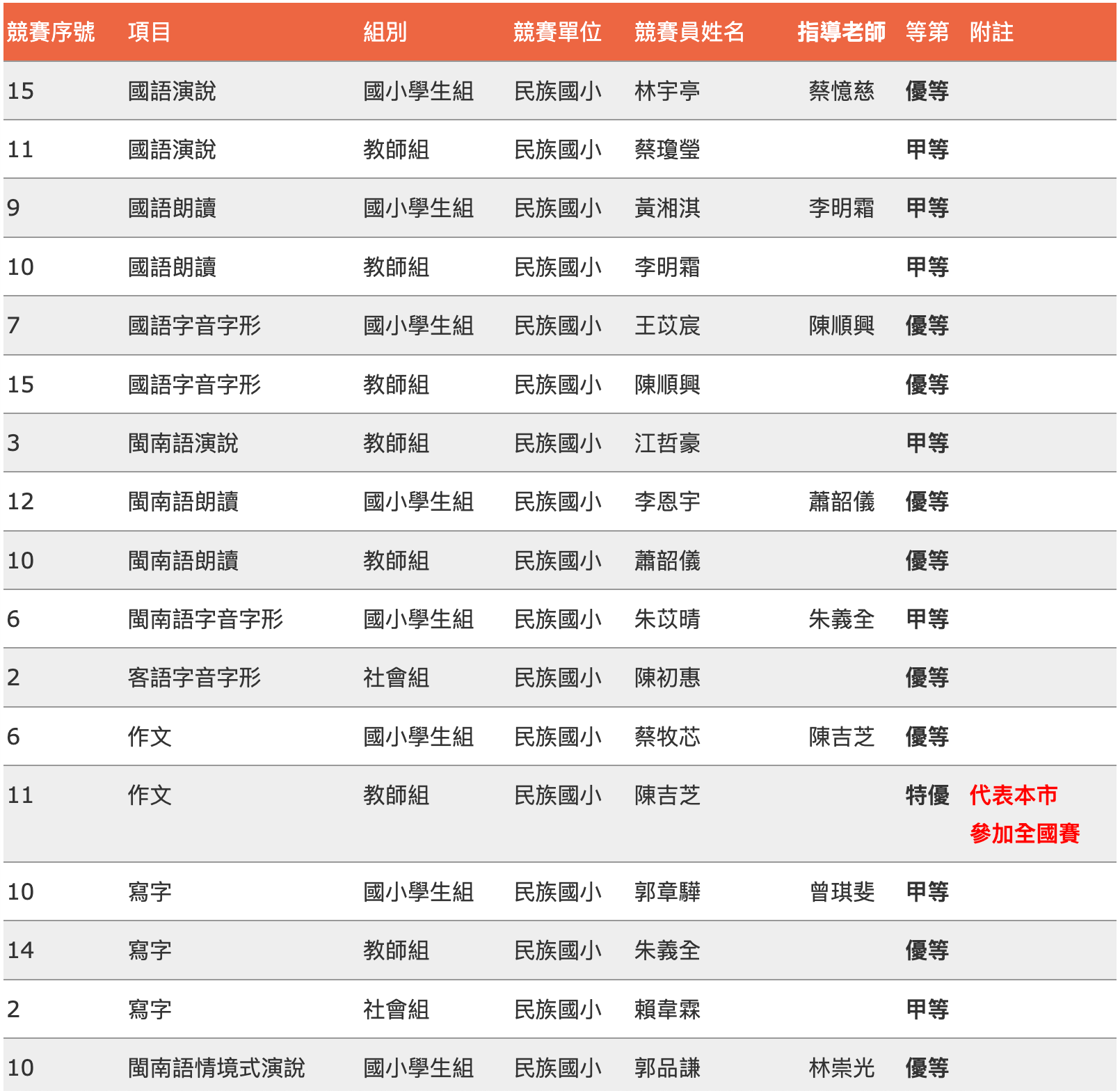 民族國小在各項比賽中展現了卓越的實力,恭喜所有獲獎的選手師生和指導老師!