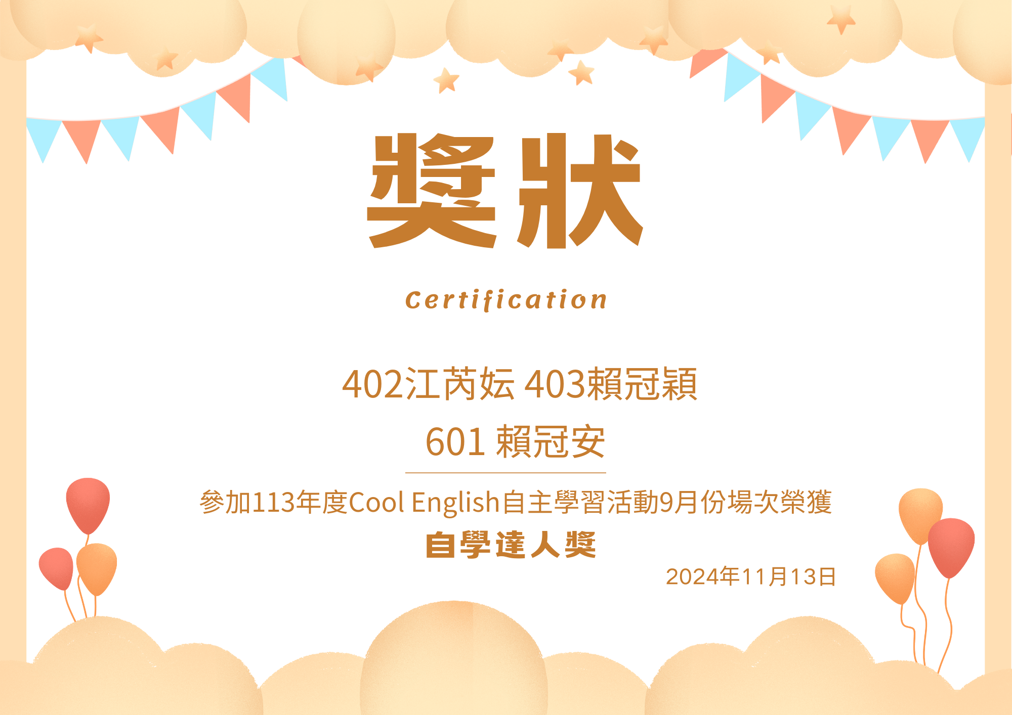 恭喜本校學生參加COOL ENGLISH九月份自主學習活動,榮獲自學達人獎